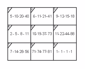112– هر خط یا نشانهای که در چهار مربع بیرونی، ظاهر شده باشد، طبق قوانین زیر به دایره مرکزی منتقل میشود. اگر تعداد خط یا نشانهای که در دایرههای بیرونی ظاهر شده باشد :